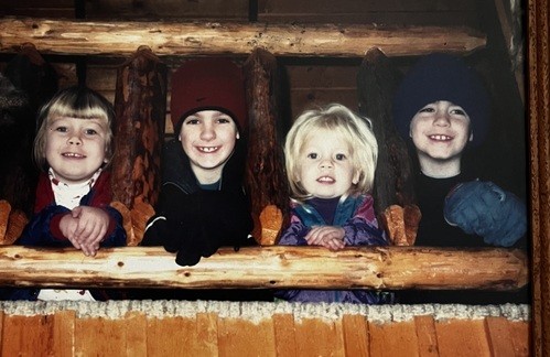 Here's a picture of me (on the right) with my brother and two cousins at our infamous Christmas at the cabin many (many) years ago. (And the crowd said, "Awwwe!")